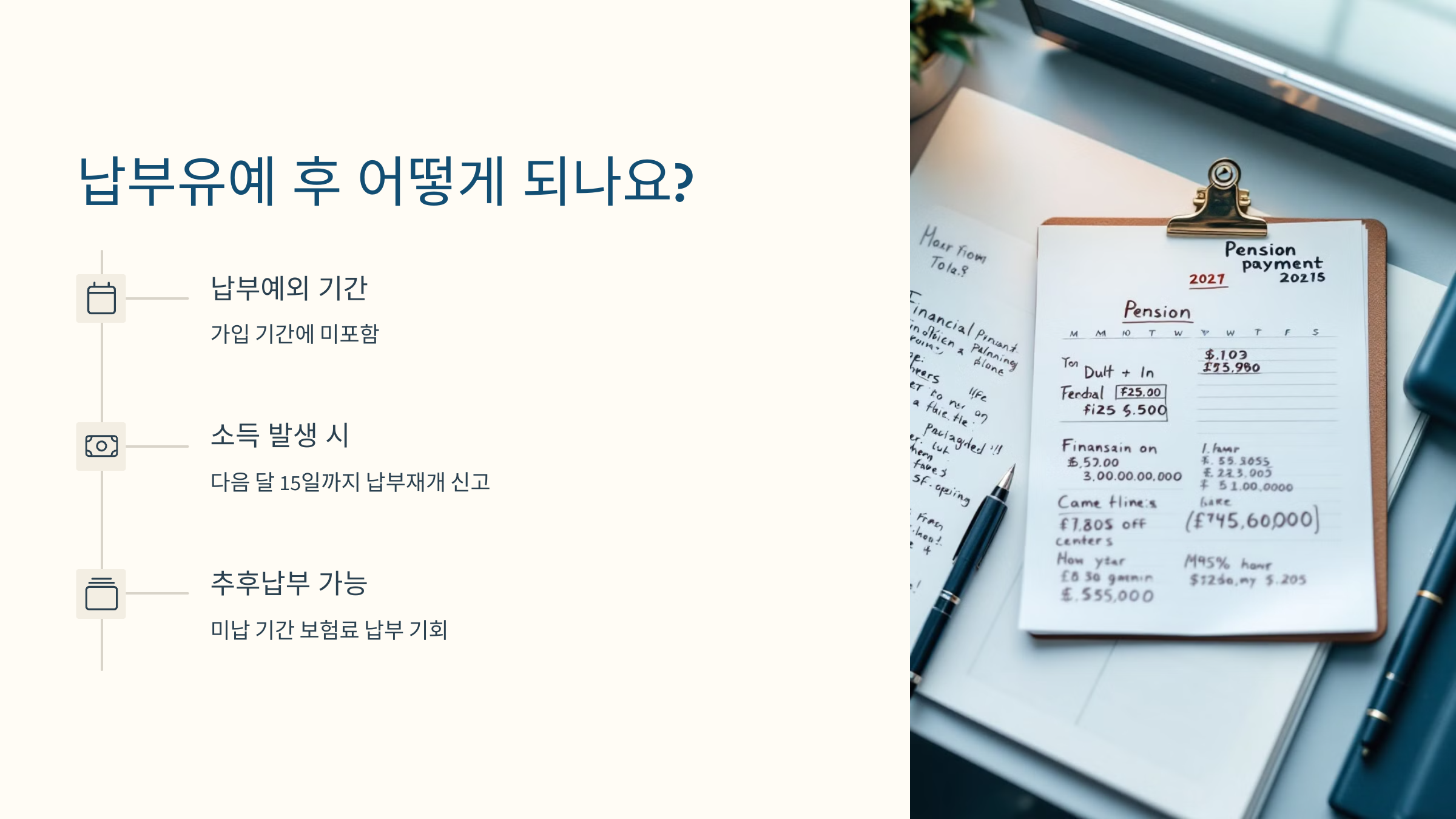 이 제도를 잘 활용하면 당장의 부담을 덜고, 경제 사정이 나아졌을 때 다시 납부를 재개할 수 있어요. 불이익 없이 경력을 이어가는 방법 중 하나랍니다. 👌